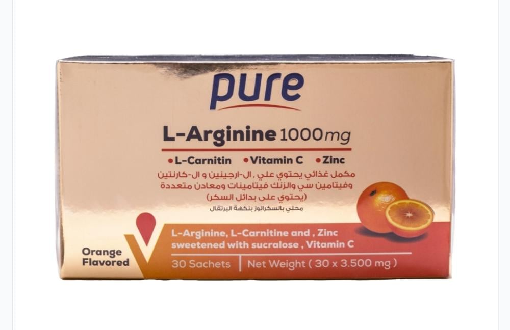 بيور مكمل غذائي يحتوي علي ال ارجنين وال كارنيتين وفيتامين سي والزنك مع فيتامينات متعددة بنكهة البرتقال 30 كيس
