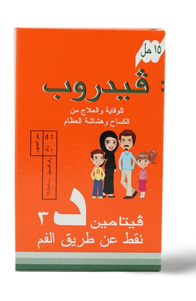 نقط عبر الفم للوقاية والعلاج من الكساح ولين العظام.اطلب استشارة الطبيب.يحفظ بعيدًا عن متناول الأطفال.يحتوى كل 1 مل (28 نقطة) على فيتامين د 3 (كوليكاسيفيرول) 2800 وحدة دولية